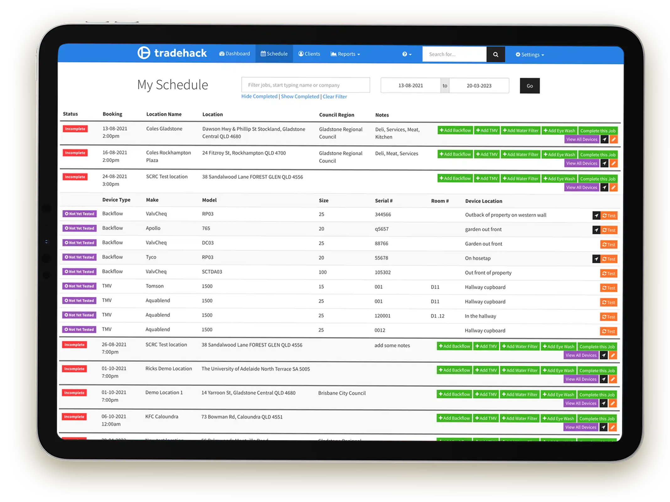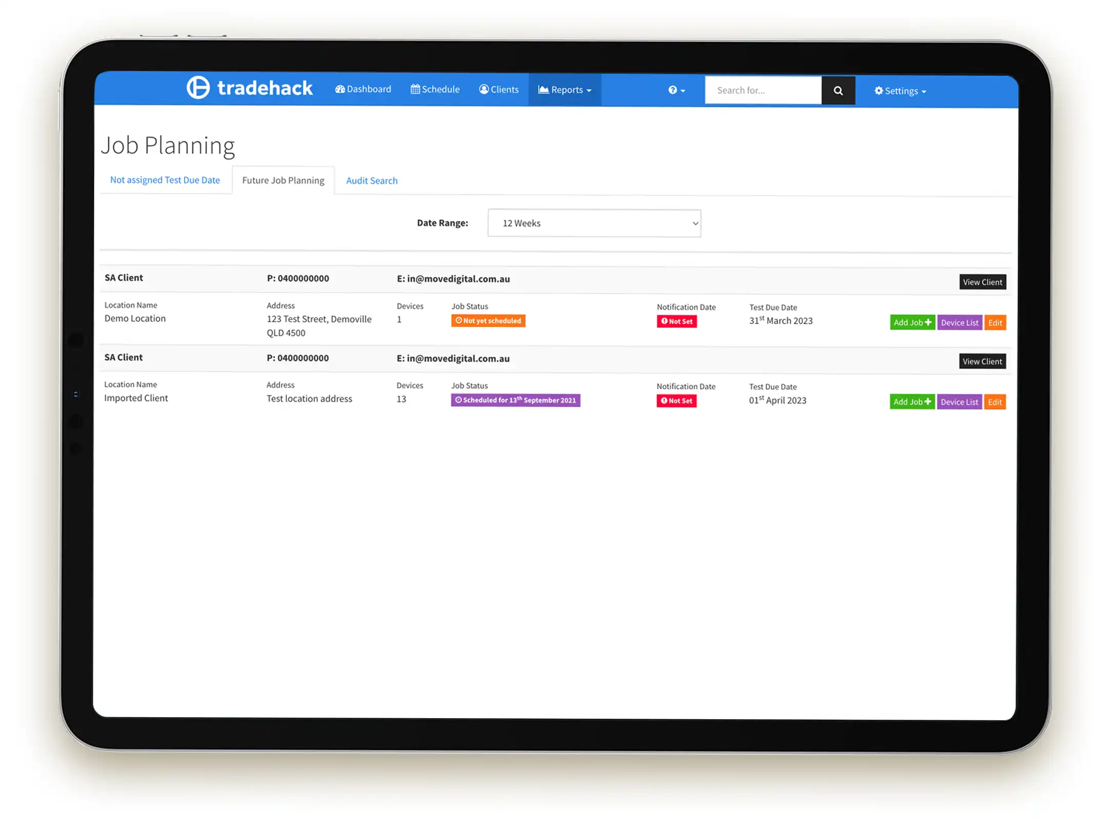 Tradehack has a powerful job planning tool which allows you to quickly search for devices that are about to become due for testing and schedule jobs to testers.